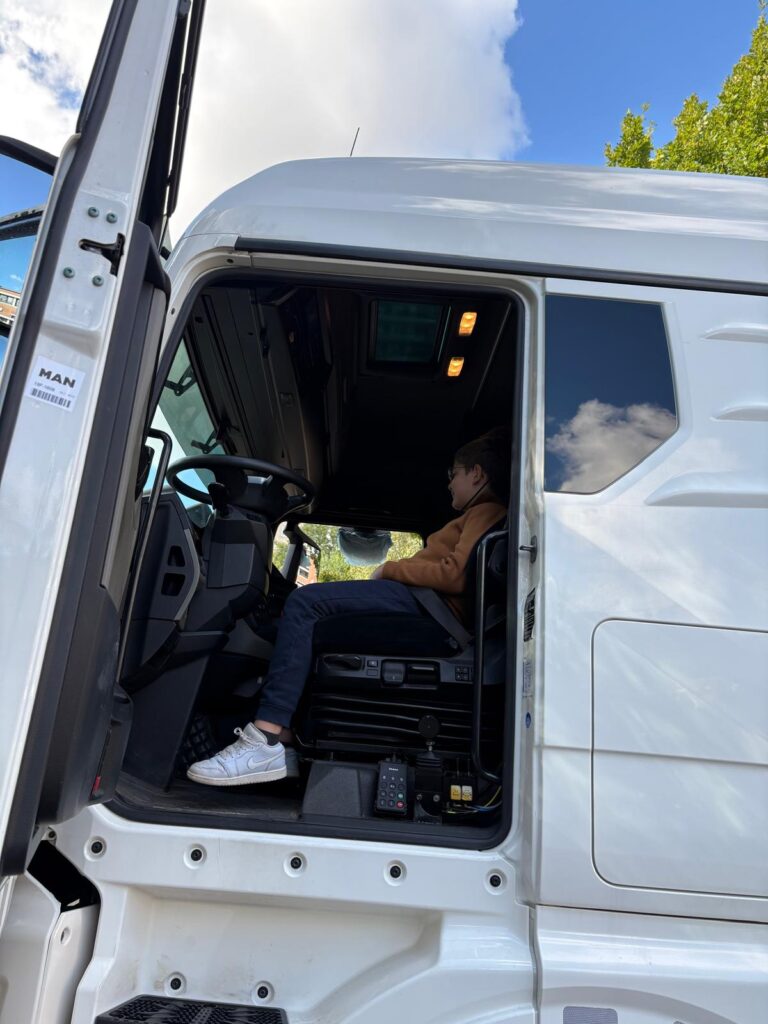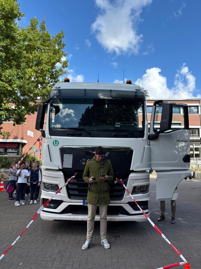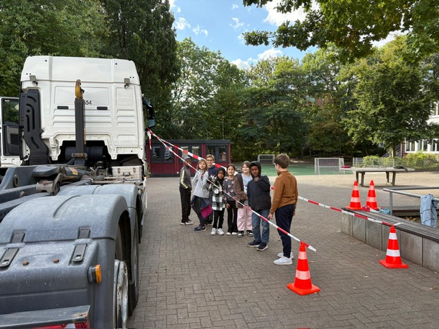 Am 23.09. hatten wir ungewöhnlichen Besuch auf unserem Schulhof. Ein Lastwagen war dort, um im Rahmen der Verkehrserziehung auf die Gefahren des Toten Winkels aufmerksam zu machen. Ein engagiertes Team vom „Round Table“ hat diese Aktion möglich gemacht. Die Bereiche, die für den Fahrer eines LKW‘s nicht sichtbar sind, wurden durch Flatterband gekennzeichnet. Jedes Kind konnte sich das einmal aus der Sicht des Fahrers anschauen. Und tatsächlich, kein Kind war innerhalb der Absperrungen zu sehen. Deshalb das wichtige Motto befolgen: